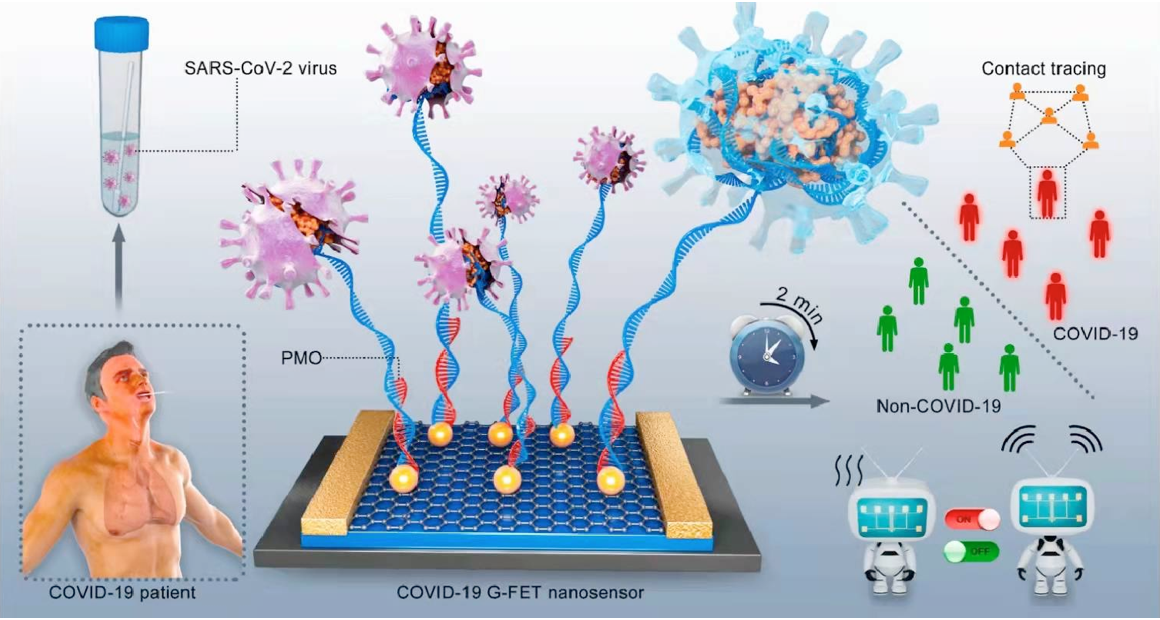 石墨烯场效应晶体管生物传感器快速检测新冠病毒示意图