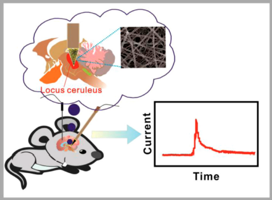 4.发展基于针灸针的新型传感技术,用于活体信号分子实时监测研究。去甲肾上腺素是中枢神经系统中的一种重要的神经递质,许多疾病都与去甲肾上腺素的分泌有关,如原发性高血压、抑郁症、精神分裂症、神经退化性疾病等。因此,检测活体内去甲肾上腺素的分泌变化具有重要的生理学与病理学意义。团队将针灸针与纳米技术结合,制备了一种纳米材料修饰的针灸传感针,实现了鼠脑去甲肾上腺素的实时监测, 研究成果发表于《Chinese J. Anal. Chem》(Chinese J. Anal. Chem.2021.49, 35–40)。