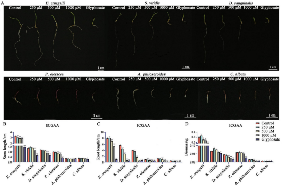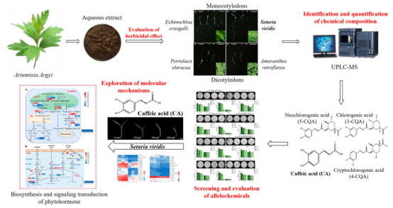 研究团队首次发现艾叶水提物对单子叶杂草狗尾草(Setaria viridis)、稗草(Echinochloa crusgalli)和双子叶杂草马齿苋(Portulaca oleracea)、反枝苋(Amaranthus retroflexus)具有较强的抑制活性。团队以抑草活性为导向,并结合LC-MS开展定向分离,发现酚酸类化合物异绿原酸A为艾叶中主要化感活性物质,并在艾叶的生长土壤中检测到异绿原酸A,表明艾叶可通过向环境中释放异绿原酸A抑制杂草生长。同时,以对6种不同科属杂草生长的抑制作用证实了异绿原酸A的抑草活性具有广谱性,表明异绿原酸A可作为绿色除草剂,还可能作为先导化合物,为新的除草剂提供思考和启示。