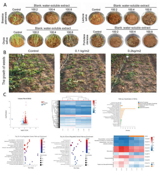 据悉,团队早在2018年就在国内率先开展植物源除草剂方面系统开发研究工作,最早发现艾叶不同提取物对多种植物的化感作用,尤其是水提物的效果显著。盆栽实验显示,艾叶水提物对白菜、莴苣、水稻、马齿苋、酢浆草和狗尾草等植物种子萌发和生长具有化感抑制作用,提示艾叶对双子叶植物和单子叶植物均有抑制作用,且不仅对种子萌发有抑制作用,对幼苗生长也有抑制作用。此外,田间试验表明,艾叶对菊花田间杂草的生长有显著的抑制作用,对菊花的生长没有不良影响。RNA-Seq分析和关键基因检测分析表明,艾叶通过多途径、多靶点地抑制杂草萌发和生长,而抑制植物叶绿素合成是其关键机制之一。该部分研究“Allelopathic effect of Artemisia argyi on the germination and growth of various weeds”于2021年2月发表于国际综合性期刊Scientific Reports。