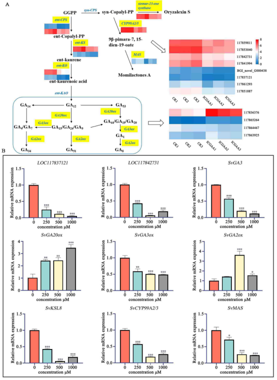 研究团队利用RNA-seq技术阐明了异绿原酸A处理后杂草的转录水平变化,共有716个基因差异表达,其中上调439个,下调277个。GO功能分类发现差异表达基因(DEGs)主要分布在“生物过程”“细胞组分”和“分子功能”。KEGG富集分析表明抑制“二萜类生物合成”途径是异绿原酸A发挥抑草活性的重要作用机制,主要抑制杂草赤霉素和植物抗毒素的生物合成,并通过RT-qPCR和赤霉素含量测定进行了验证。