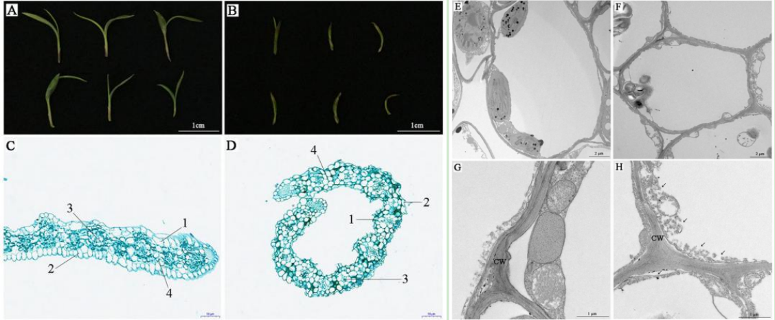 生理分析表明,异绿原酸A处理后杂草叶片皱缩、发黄、枯死,光学显微镜和透射电镜观察发现异绿原酸A可造成叶片表皮细胞萎缩,叶脉维管束鞘细胞增大,内部叶绿素下降;细胞膜溶解并脱离细胞壁,细胞器解体等。