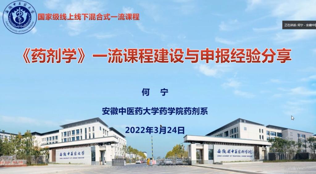 会议重点介绍了国家级和省级一流本科课程申报的相关政策和审核指标,梳理了一流本科课程申报背景、申报指南、申报材料的相关内容。《高分子物理学》国家级线下一流课程负责人,湖北大学王国成教授从认识一流本科课程、一流本科课程申报条件、线下一流本科课程申报材料撰写重点三个方面解读了国家级一流课程的申报要点,并同与会人员分享了相关申报材料。《药剂学》国家级线上线下混合式一流课程负责人,安徽中医药大学何宁教授,结合自身丰富的一流课程建设和申报经验,围绕课程基本情况、课程改革建设、课堂教学实践和一流课程申报四个方面,分享了线上线下混合式一流课程建设的思路、方法和心得。