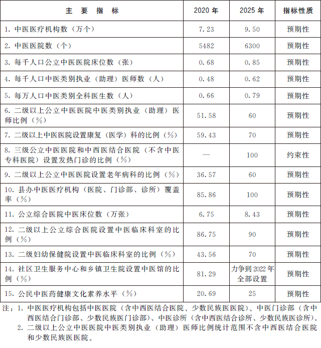 (三)发展目标。到2025年,中医药健康服务能力明显增强,中医药高质量发展政策和体系进一步完善,中医药振兴发展取得积极成效,在健康中国建设中的独特优势得到充分发挥。