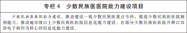 3.发展少数民族医药。加强少数民族医医疗机构建设,提高民族地区基层医疗卫生机构少数民族医药服务能力。改善少数民族医医院基础设施条件,加强少数民族医医院专科能力、制剂能力和信息化能力建设。建立符合少数民族医医疗机构自身特点和发展规律的绩效评价指标体系。加大少数民族医药防治重大疾病和优势病种研究力度,有效传承特色诊疗技术和方法。鼓励和扶持少数民族医药院校教育、师承教育和继续教育。加大对少数民族医药的传承保护力度,持续开展少数民族医药文献抢救整理工作,推动理论创新和技术创新。
