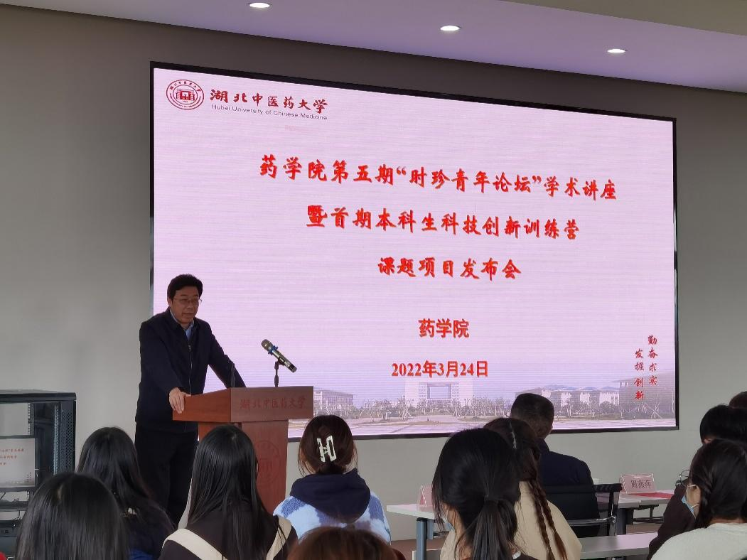 本网讯 3月24日,药学院“时珍青年论坛”第五期学术讲座暨第一期本科生科技创新训练营课题发布会在本草苑A401举行。副校长黄必胜出席活动并致辞,中国农业科学院农业基因组研究所苟君波博士,药学院杜鸿志副教授作学术讲座,药学院领导班子成员参加活动,活动由学院相关负责人主持。