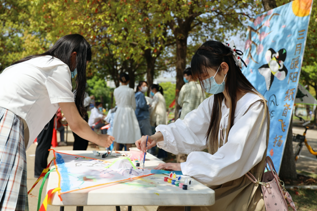 在北区篮球场,同学们在工作人员的引导下,保持一米距离,依次在活动登记区领取活动集章便签。游戏区设有“集鸢窥春”风筝照片拼图、“木鹞绕云”绕凳障碍穿越、“逆风鸣嬉”反口令做动作、“引竹释晦”牙签夹小黑豆四个游戏,完成游戏打卡的同学,可在抽奖区领取一个空白风筝。活动中,同学们以“春”为主题,结合中医药特色手绘风筝,并现场放飞作品,校园上空成为了风筝的海洋,欢声笑语久久回荡。
