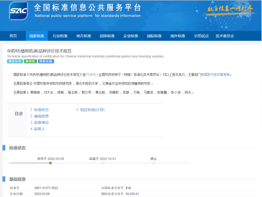 本网讯 近日,国家市场监督管理总局(国家标准化管理委员会)发布了2022年第2号中国国家标准公告,批准和公布了《高标准农田建设通则》等357项推荐性国家标准和4项国家标准修改单,由中国中医科学院中药研究所和学校联合制定的《中药材(植物药)新品种评价技术规范》标准(GB/T 41277-2022)位列其中,并将于2022年10月1日正式实施。