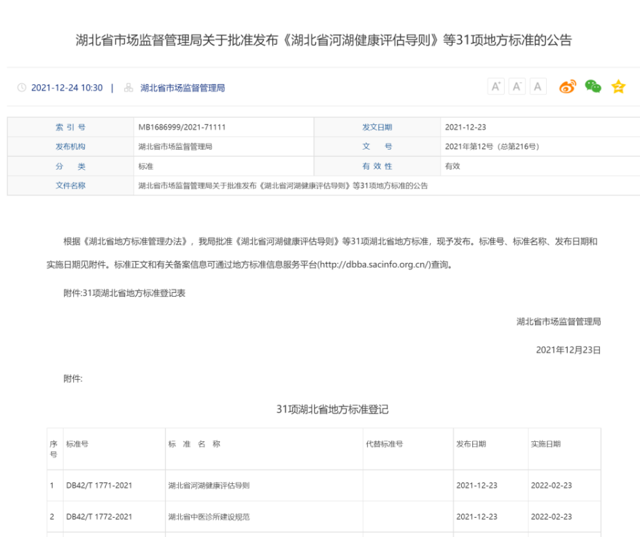 本网讯 近日,湖北省市场监督管理局批准和发布了31项地方标准,由人文学院赵敏教授团队牵头制订的《湖北省中医诊所建设规范》(DB42/T 1772-2021)位列其中,于2月23日正式实施。