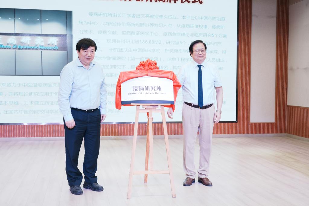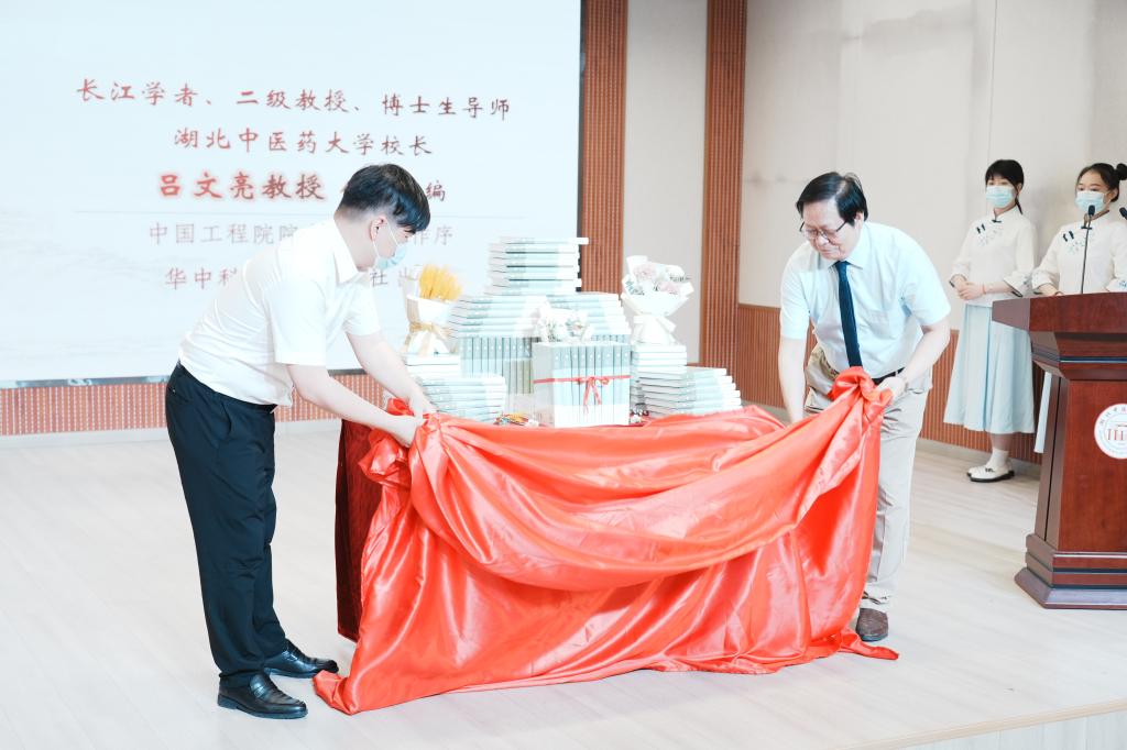 现场还举行了荆楚医学流派名家系列(丛书)(第一辑)首发仪式、湖北中医药大学疫病研究所揭牌仪式。华中科技大学出版社副社长车巍、丛书总主编吕文亮教授、校党委常委张子龙教授出席首发仪式并发表讲话。随后,吕文亮教授、副校长王平教授共同为学校疫病研究所揭牌。