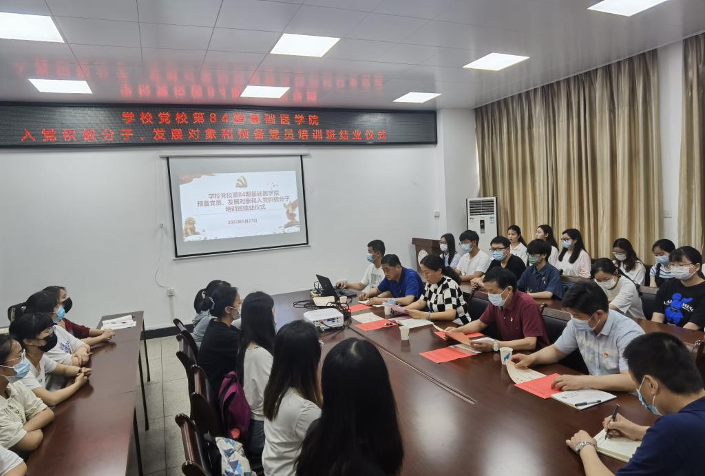 本网讯 5月27日,学校党校第84期基础医学院入党积极分子、发展对象和预备党员培训班结业仪式在黄家湖校区杏林阁D103举行。校党委副书记李水清,基础医学院党政领导班子成员、专职组织员、专职辅导员和第84期基础医学院培训班学员代表40余人参加活动。