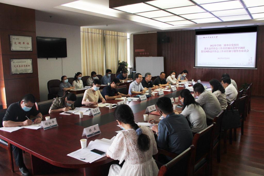 本网讯 5月25日至26日,校党委常委张子龙带领学校意识形态工作责任制检查考核小组第三组成员单位负责人、相关负责人,分别在黄家湖校区图书馆8楼会议室、昙华林校区图书馆2楼中医临床学院会议室组织召开两场督导调研座谈会,对二级单位党组织落实意识形态工作责任制情况、落实网络意识形态工作责任制情况进行内巡督导调研和专题督查。相关单位班子成员、中心组成员,党务秘书,党支部书记、辅导员代表参加会议。图书馆党总支负责人、中医临床学院党委负责人分别主持会议。