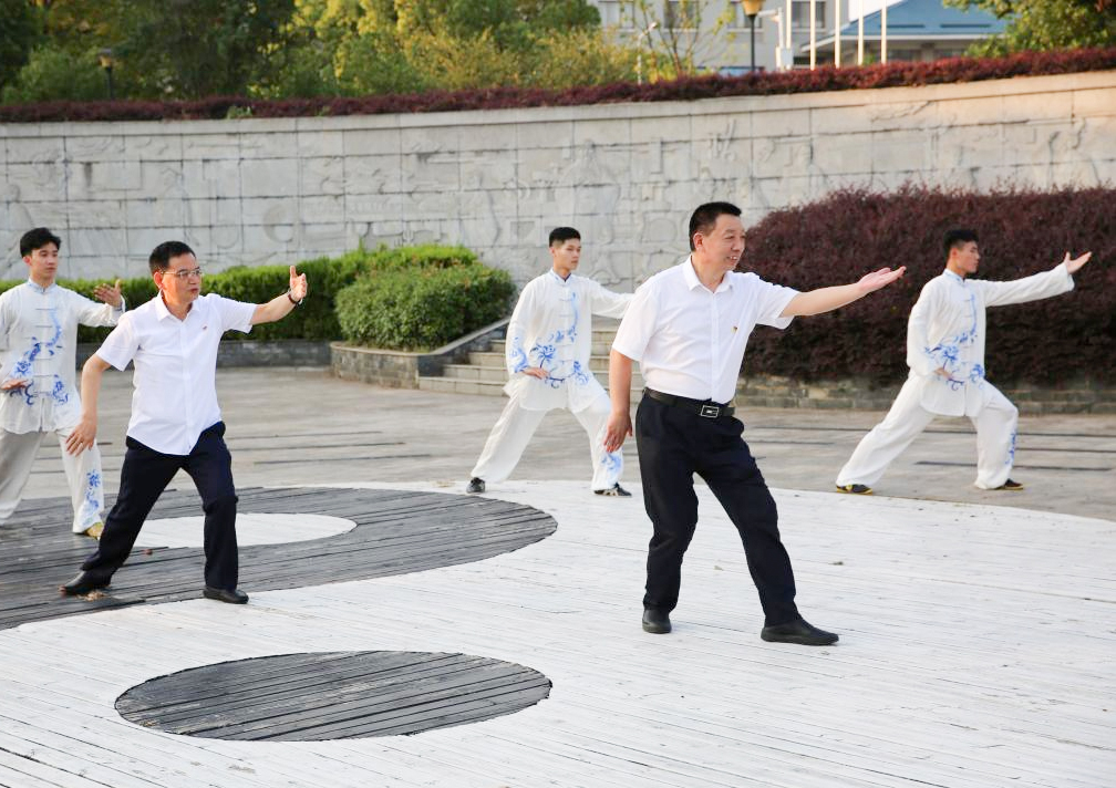 省教育厅副厅长周启红与校武术队队员一起打太极拳