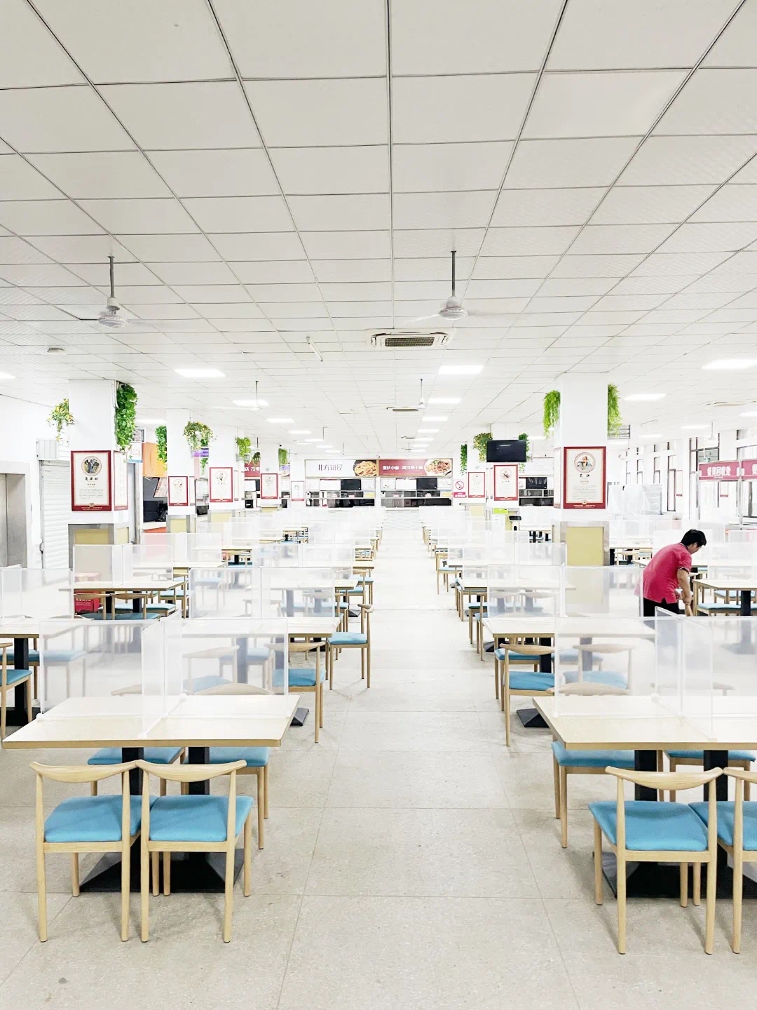 食堂内外翻新,就餐大厅桌椅换新440套,餐桌设置隔离挡板,窗口安装价格显示屏。昙华林食堂、海景苑食堂、综合食堂一楼完成后厨改造,就餐、消费更卫生、更透明。
