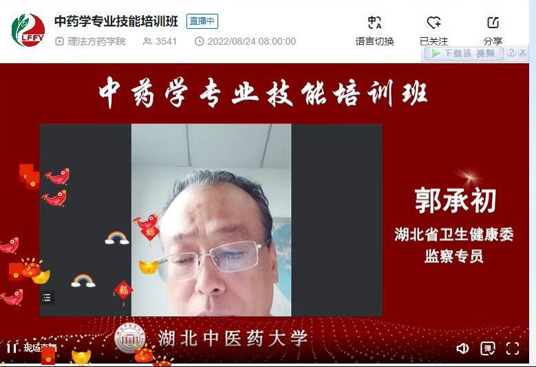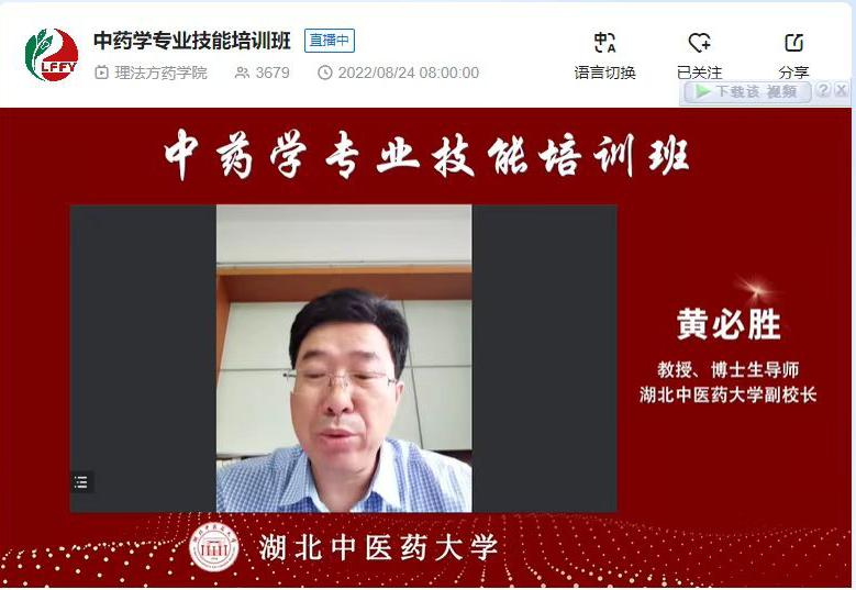 本网讯 8月24日至25日,由湖北省卫生健康委员会指导、我校主办、九州通医药集团股份有限公司协办的中药学专业技能培训班在“理法方药学院”直播平台举办。湖北省卫生健康委员会监察专员郭承初,我校副校长黄必胜教授出席开班仪式。岐黄学者王平教授、药学院吴和珍教授、游秋云教授、胡志刚教授等专家为学员授课。开班仪式由游秋云主持。来自湖北、北京、河北、湖南等15个省(市)的学员参加培训班学习。