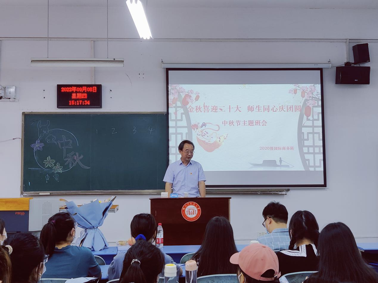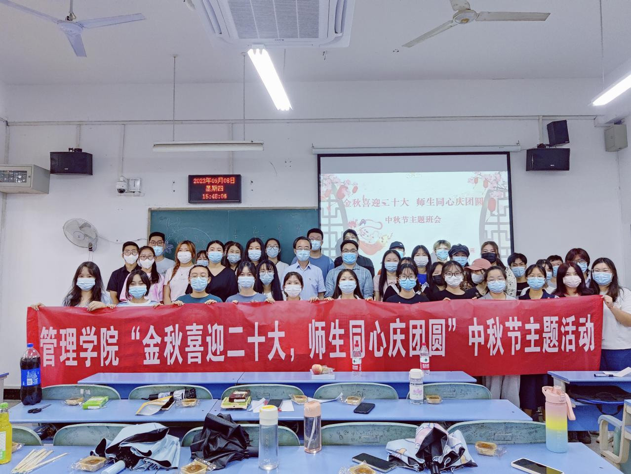 本网讯 为落实立德树人根本任务,深入推进校领导联系班级制度,弘扬中华优秀传统文化,厚植学生家国情怀,9月8日,在中秋节、教师节来临之际,管理学院举办“金秋喜迎二十大,师生同心庆团圆”中秋节主题系列活动。校党委副书记张子龙,管理学院教师、专职辅导员参加活动,与同学们一起度过愉快而有意义的中秋节。