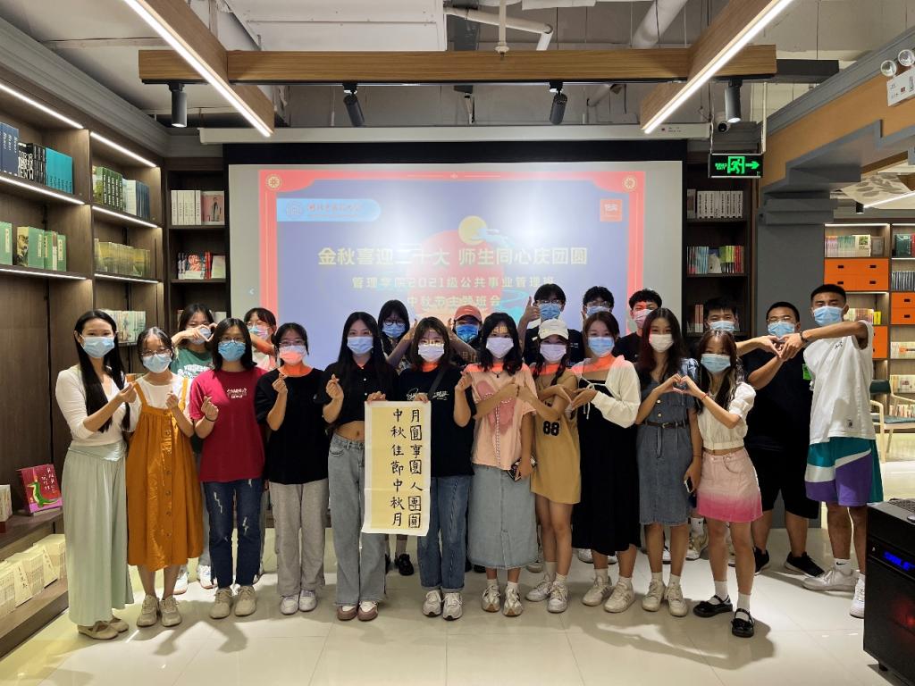 管理学院2021级公共事业管理班在图书馆倍阅书店开展中秋主题班会,同学们通过学习中秋节起源与习俗、诵读中秋经典诗词、展示书法作品、书写中秋“微心愿”等活动,进一步了解了中华民族传统节日的文化内涵;2019级国际商务班师生们一起制作月饼;2019级市场营销1班、2班组织开展中秋节户外主题团日活动,增强班级凝聚力……不少班级通过线上线下相结合的方式,开展了丰富多彩的中秋节主题活动。