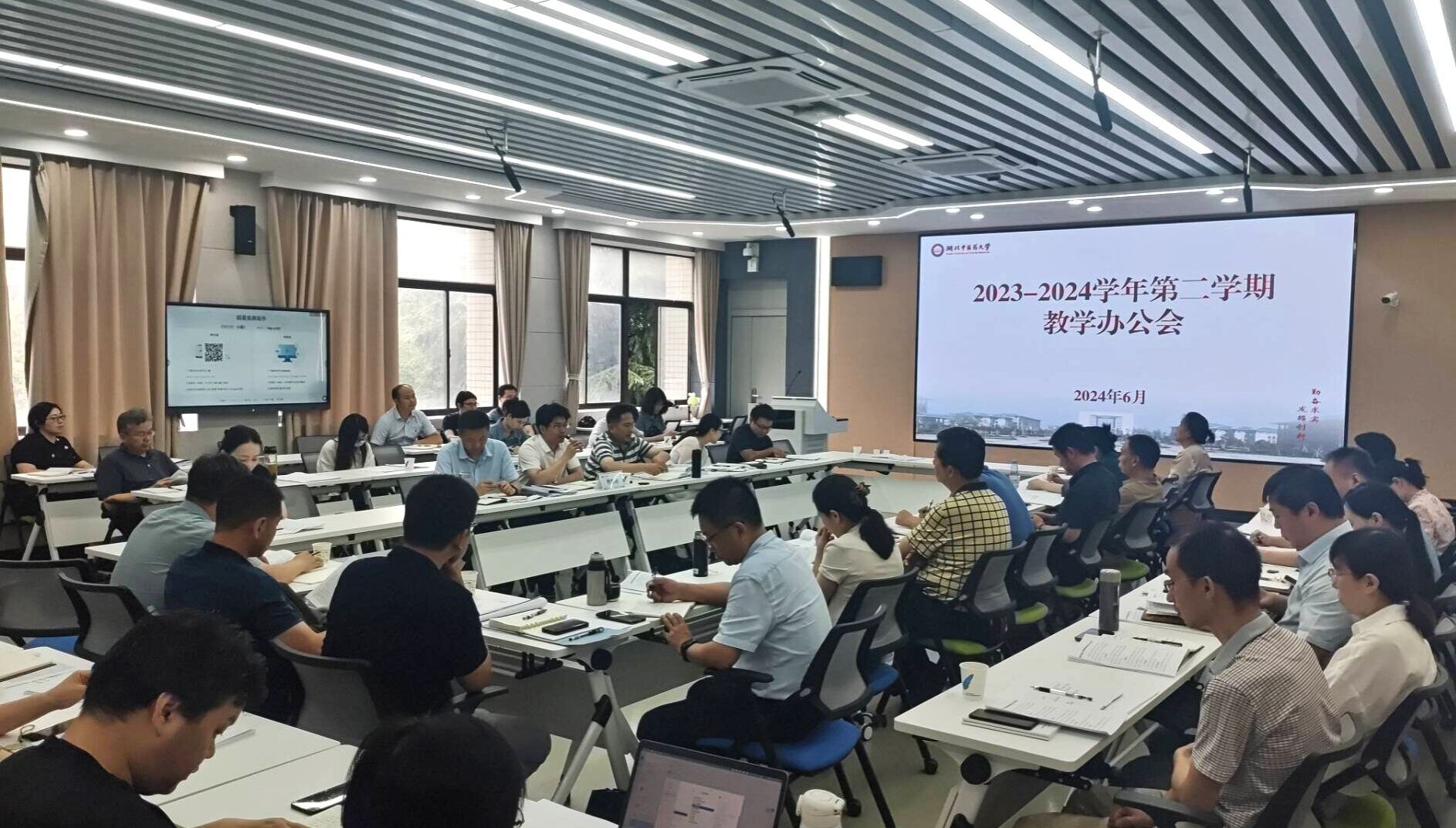 本网讯 6月19日,学校在黄家湖校区本草苑Y102智慧教室召开2024年春季学期第二次教学办公会。校党委常委曹继刚主持会议。各学院分管教学工作负责人、教学秘书及相关职能部门负责人参加会议。