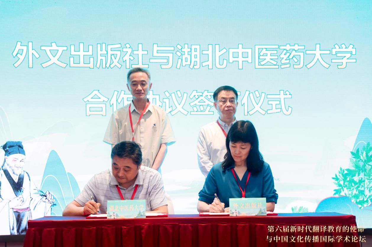 本网讯 6月23日,由湖北中医药大学、湖北时珍实验室、湖北省翻译工作者协会主办的第六届新时代翻译教育的使命与中国文化传播国际学术论坛在时珍故里——湖北蕲春举行。论坛开幕式现场,学校与外文出版社签订合作协议。