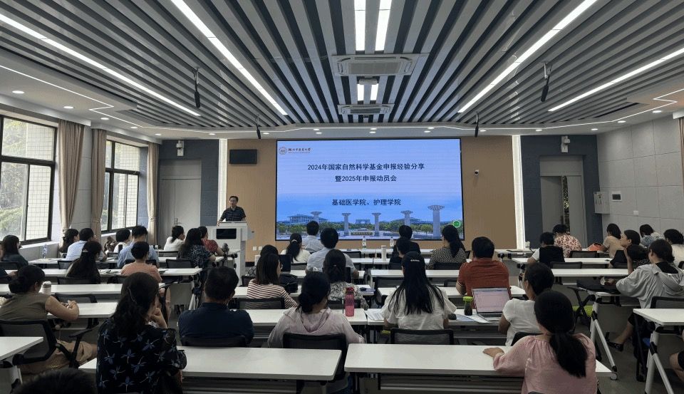 本网讯 为做好2025年国家自然科学基金申报组织工作,9月5日,基础医学院、护理学院在本草苑Y102智慧教室举行2024年国家自然科学基金申报经验分享暨2025年申报动员会。副校长刘建忠,基础医学院、护理学院领导班子成员及全体专任教师共120余人参加会议,会议由基础医学院相关负责人主持。