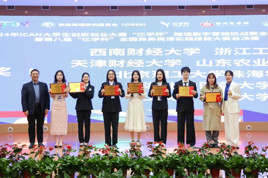 本网讯 11月16日, 2024年iCAN大学生创新创业大赛“亿学杯”跨境数字营销挑战赛全国总决赛暨第八届“亿学杯”全国商务英语实践技能大赛总决赛在郑州落幕。由学校外国语学院商务英语专业马俐丫、王佳新、柯达、彭芷晴、杨安禾组成的学生团队在全国总决赛31支参赛队伍中脱颖而出,荣获全国一等奖,实现了学校在该类国家级竞赛中的首次突破。