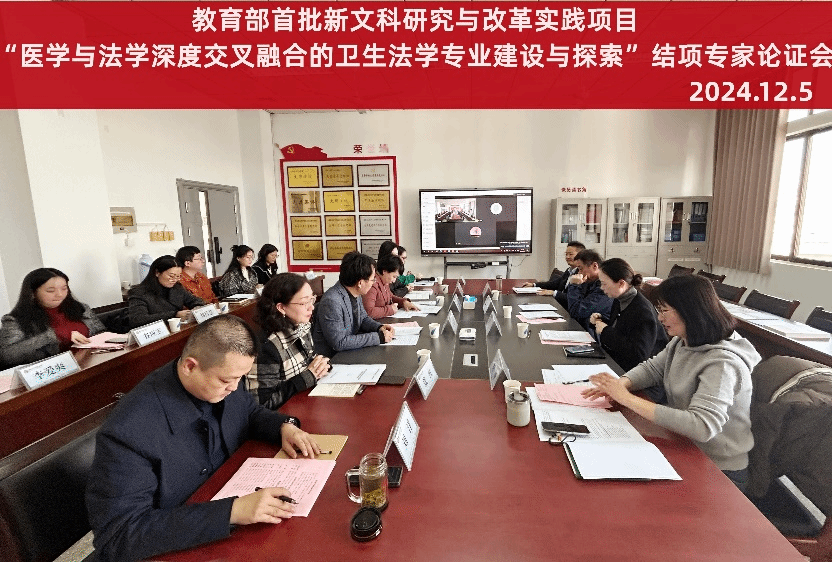 本网讯 12月5日,学校召开教育部首批新文科研究与改革实践项目《医学与法学深度交叉融合的卫生法学专业建设与探索》结项专家论证会。我校特聘专家、教育部“长江学者奖励计划”特聘教授、清华大学王晨光教授,教育部“长江学者奖励计划”特聘教授、国家哲学社会科学领军人才、武汉大学人文社会科学研究院院长冯果教授,湖北省高等教育学会秘书长周进教授应邀担任项目论证专家。论证会以线上线下相结合的方式举行,学校教师发展中心负责人、医学人文学院党委负责人、课题组成员和教师代表参加会议。会议由医学人文学院党委负责人主持。