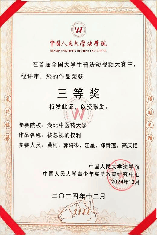 本网讯 12月4日,首届全国普法短视频大赛颁奖仪式暨国家宪法日主题沙龙活动在北京举行。我校医学人文学院2021级公共事业管理(医事法学)专业学生团队作品《被忽视的权利》(指导老师:张宇清;参赛学生:黄柯、郭海岑、江星、邓青莲、高庆艳)获三等奖。