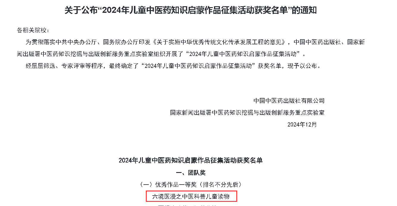 本网讯 12月4日,由中国中医药出版社、国家新闻出版署中医药知识挖掘与出版创新服务重点实验室组织开展的“2024年儿童中医药知识启蒙作品征集活动”公布获奖名单。我校针灸骨伤学院青声漫语话岐黄团队作品《六境医漫之中医科普儿童读物》(项目成员:许浩、许文静、吴俊霆、孙瑞婷、张慕言、朱欣雨、叶紫、尹文郡、何静文 周涵宇、郑岚曦、丁易)获优秀作品一等奖,项目指导老师张晓林副教授获评优秀指导教师。