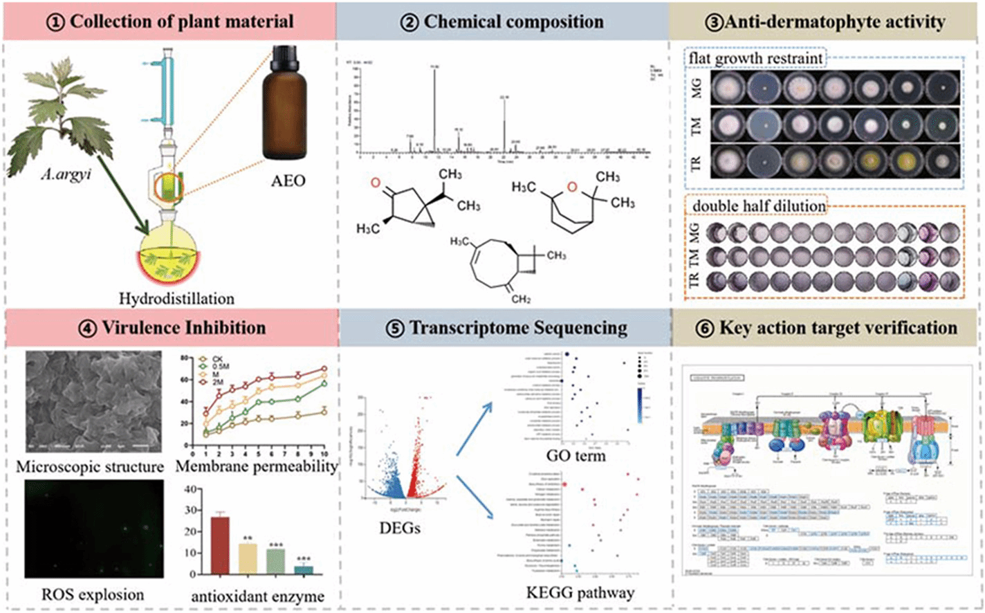 大量研究证实艾叶挥发油具有显著的抗菌活性,广泛用于药妆、消毒日化等健康医药产品中。目前,尚无充分的科学证据支撑艾叶挥发油能有效抑制皮肤真菌,特别是缺乏针对红毛癣菌、毛癣菌和石膏小孢子菌等临床上常见致病菌的研究。团队研究显示,蕲艾挥发油对3种临床常见皮肤真菌抑制作用显著,优于多数植物提取物的活性。通过转录组学结合细胞分子生物学研究,揭示蕲艾挥发油通过抑制呼吸过程中的电子转移和氧化磷酸化,导致线粒体ATP合成和能量代谢受阻,杀伤真菌。蕲艾挥发油抗真菌作用机理研究,为其应用和开发提供有力的科学依据。研究成果“Chemical composition of Artemisia argyi essential oil and its antifungal activity against dermatophytes by inhibiting oxidative phosphorylation and causing oxidative damage”于9月发表于国际传统医学领域权威期刊Journal of Ethnopharmacology (中科院医学二区,Top期刊)。