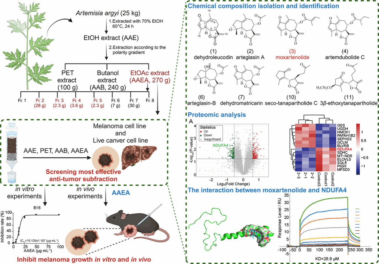 艾叶在古代本草中记载用于治疗多种皮肤疾病,近代本草记载有艾叶抗癌中草药制剂。目前,关于艾叶现代药理活性报道多为抗肿瘤作用。在此基础上,团队开展了基于抗黑色素瘤活性为导向的分离筛选评价研究,从蕲艾乙酸乙酯抗肿瘤活性部位中分离鉴定出47个化合物,其中23个化合物是艾叶中首次报道。其中,8个倍半萜类化合物抗肿瘤活性显著,药效优于艾叶常报道的化学成分。通过蛋白组学和药物靶点互作等研究,揭示代表性活性成分moxartenolide通过调控细胞代谢关键酶NDUFA4,诱导细胞凋亡和铁死亡。团队采用斑马鱼模型进行了毒理学评价,证实了药效成分的安全性。研究成果“Sesquiterpene lactone from Artemisia argyi inhibited cancer proliferation by inducing apoptosis and ferroptosis via key cell metabolism enzyme NDUFA4”于12月发表于国际传统医学领域权威期刊Phytomedicine(中科院医学一区,TOP期刊)。