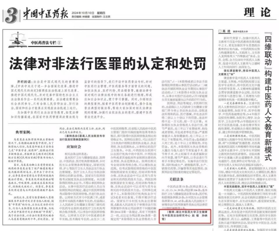本网讯 为加强中医药行业法治宣传教育,拓宽法律知识传播渠道,探索中医药普法创新模式,2024年10月起,《中国中医药报》开设“中医药普法专栏”,我校医学人文学院卫生法学团队受邀成为专栏特邀撰稿人,每月为专栏撰写2期中医药普法稿件,目前已刊登5期“以案说法”的普法案例,取得良好反响。