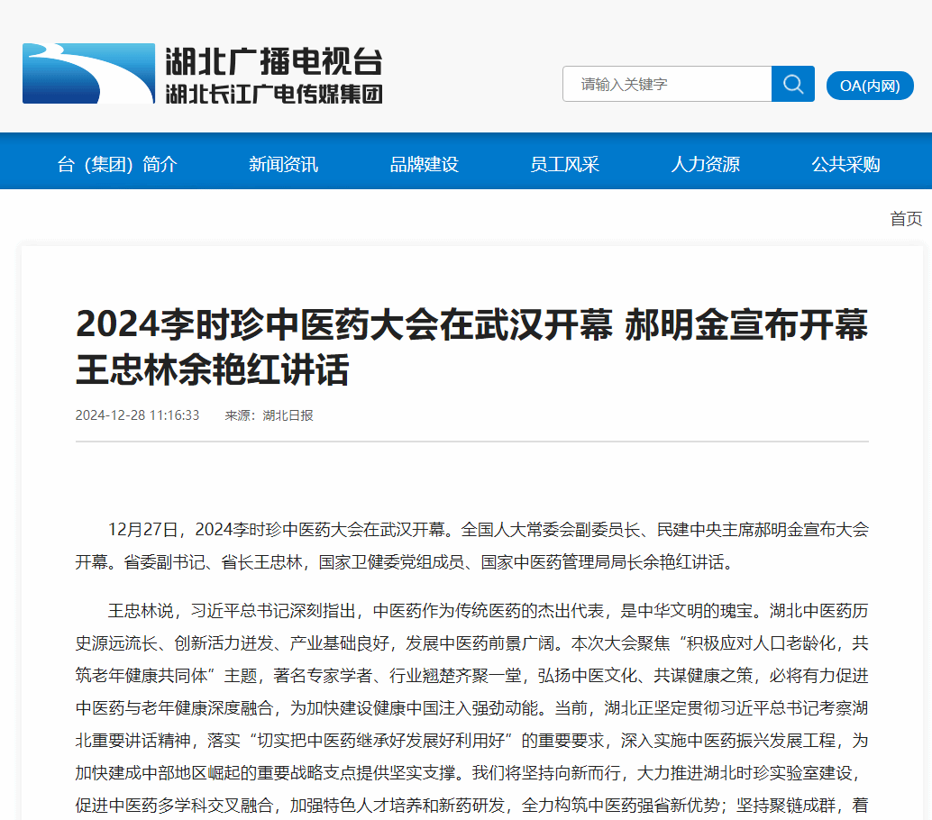 33.湖北广播电视台网:2024李时珍中医药大会在武汉开幕 郝明金宣布开幕 王忠林余艳红讲话