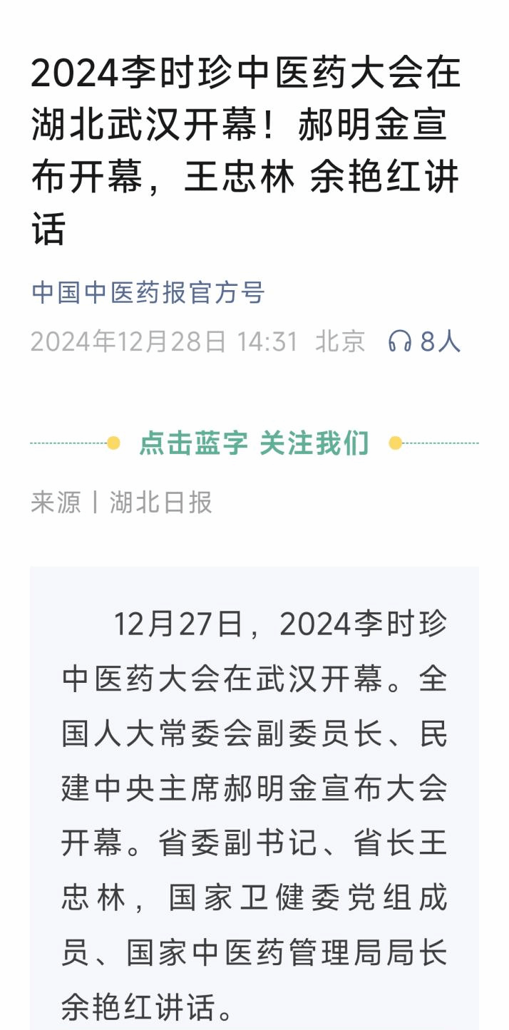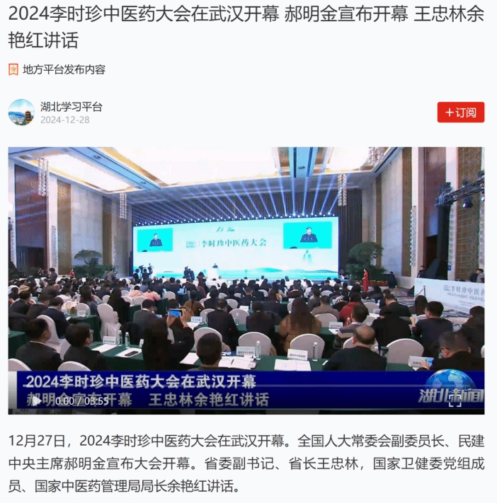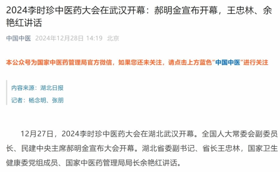 14.国家中医药管理局官方微信:2024李时珍中医药大会在武汉开幕:郝明金宣布开幕,王忠林、余艳红讲话