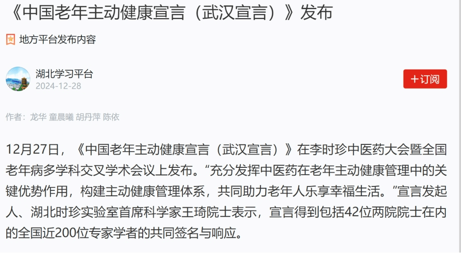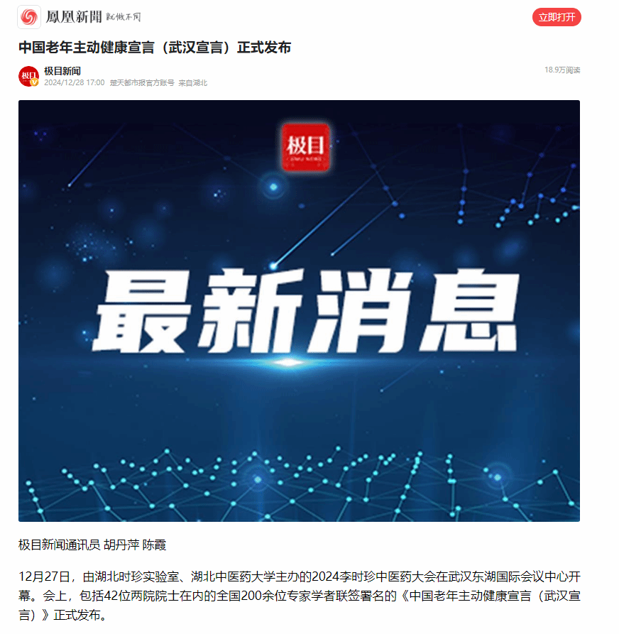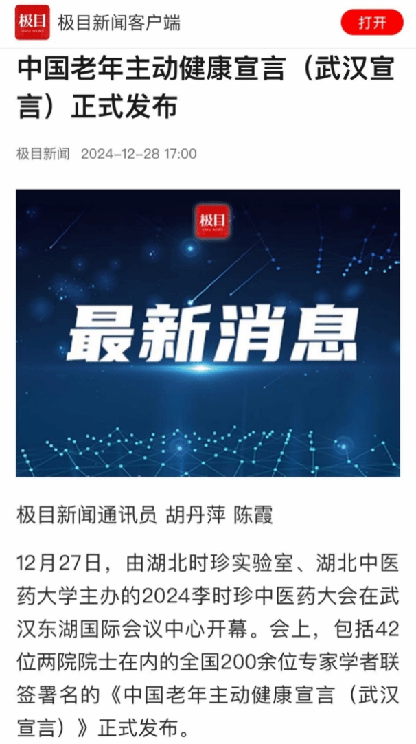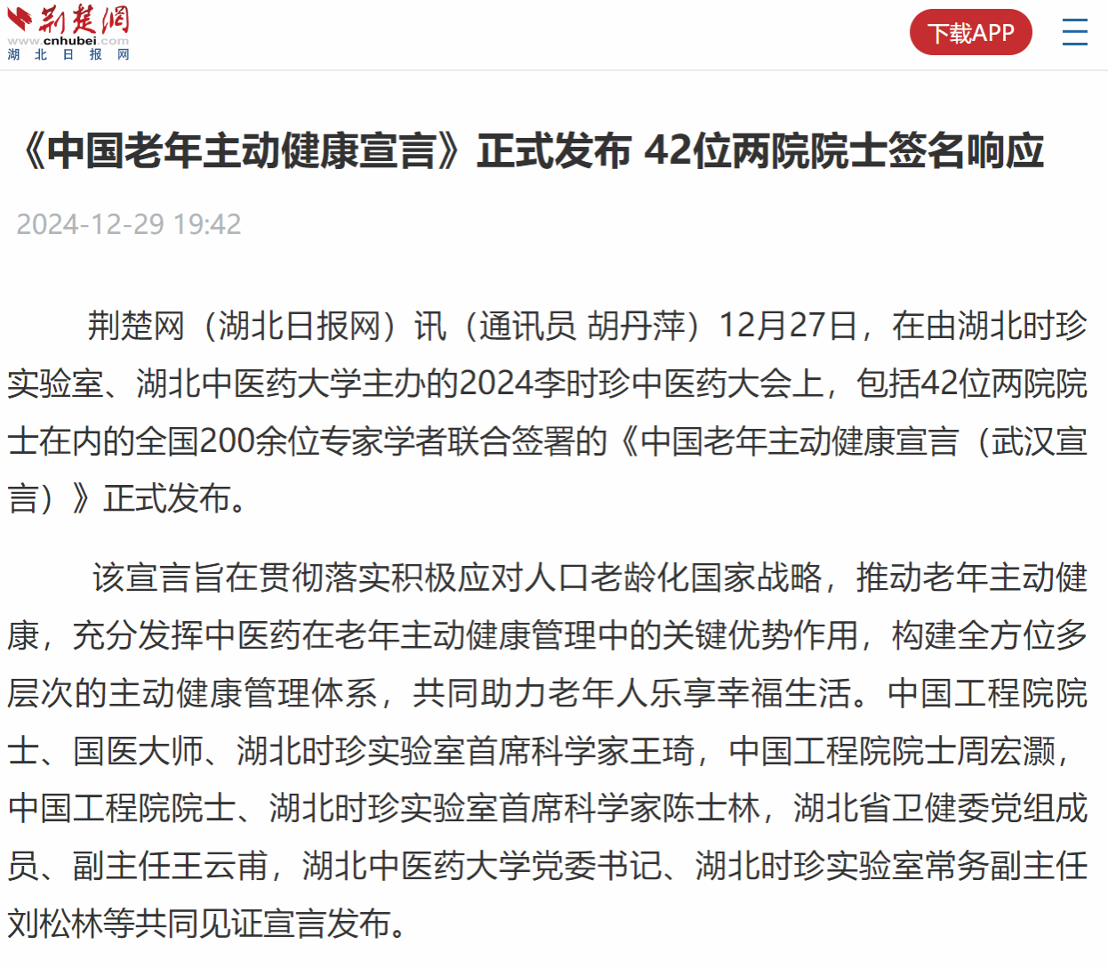 35.长江日报:2024李时珍中医药大会开幕,《中国老年主动健康宣言(武汉宣言)》正式发布