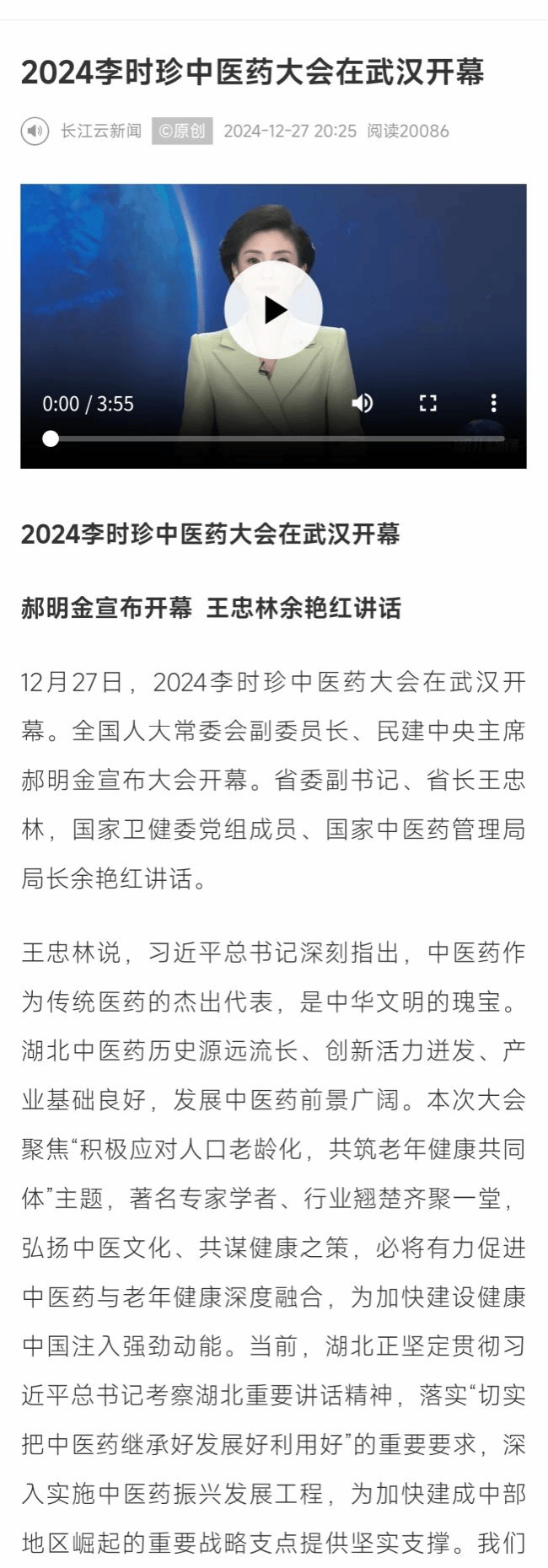 11.“学习强国”学习平台:2024李时珍中医药大会在武汉开幕 郝明金宣布开幕 王忠林余艳红讲话
