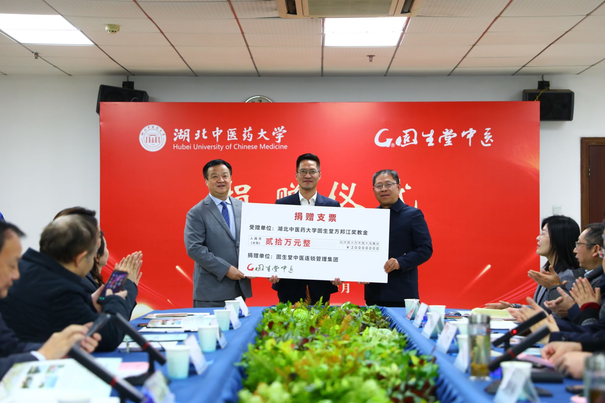 仪式上,陈刚代表学校接受固生堂中医连锁管理集团及方邦江教授捐赠支票,并向他们颁发捐赠证书。杨波与王少敏、方邦江共同签署捐赠协议。