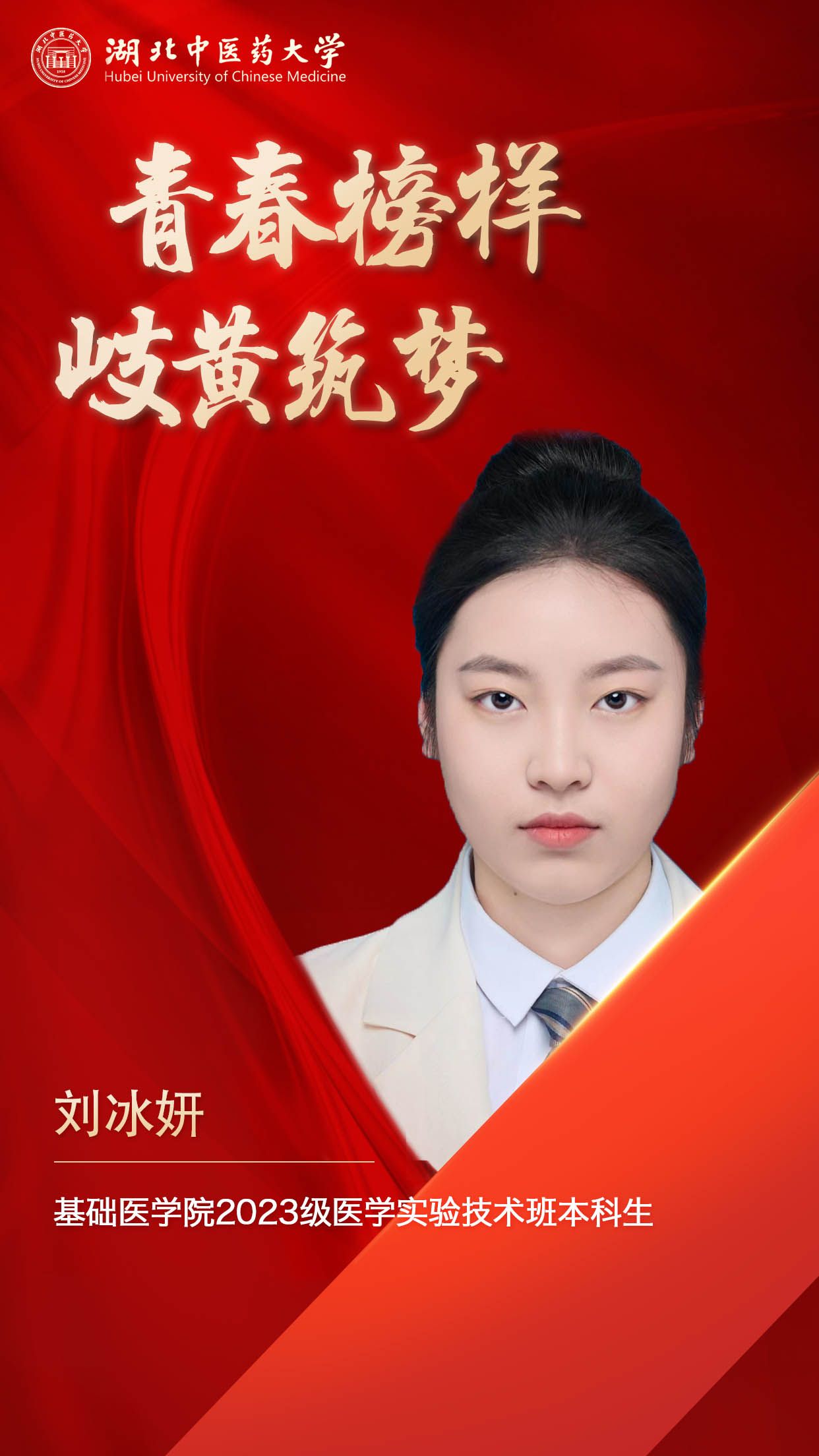 刘冰妍,基础医学院2023级医学实验技术班本科生,学院学生会主席。获国家奖学金、校级一等奖学金、优秀团员、优秀学生等荣誉。立足学院“五育并举”育人理念,打造特色品牌矩阵,创新开展寻找“最美太极人”项目,策划“中诊奇妙夜”“解剖绘图大赛”等活动,组织撰写“四百计划”社会实践报告,相关事迹获多家媒体报道。