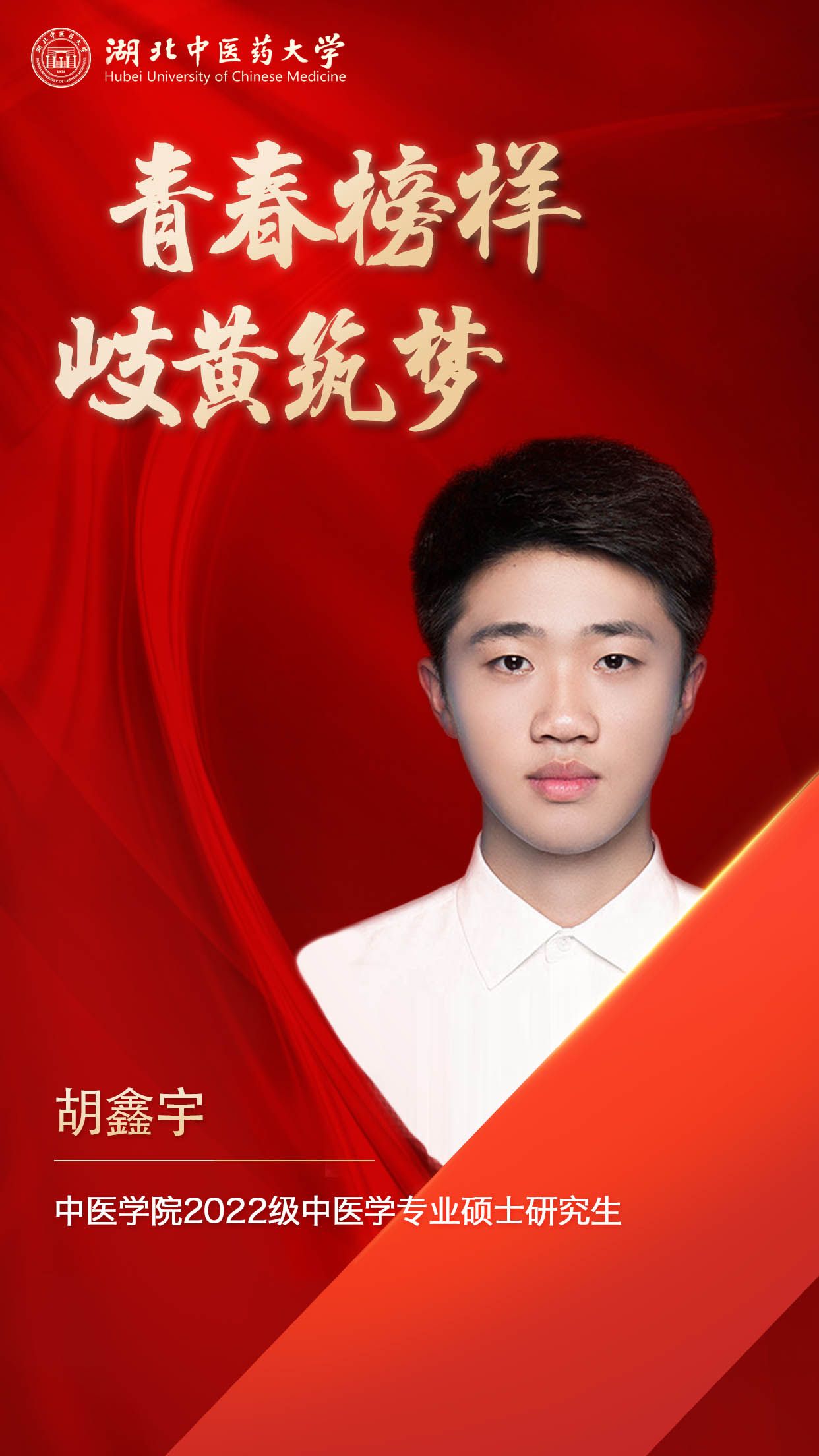 胡鑫宇,中共党员,中医学院2022级中医学专业硕士研究生,校“青马工程”第十二期优秀学员。曾任院学生会主席、学生党支部副书记,所在党支部入选湖北省高校研究生样板党支部。获国家级、省级学科竞赛奖项,国家级、校级奖学金13次。发表核心期刊、SCI论文4篇。连续四年参与学院暑期“三下乡”社会实践活动,参与“时珍国医少年班”中医药特色儿童健康护航志愿服务项目,累计授课80课时。