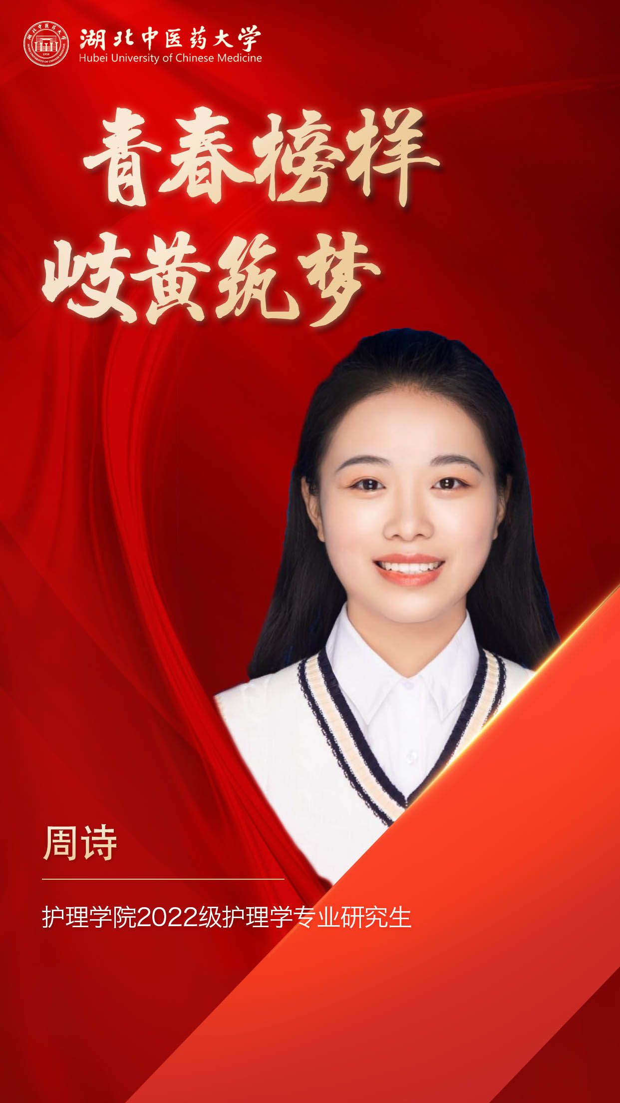 周诗,护理学院2022级护理学专业研究生。知行合一,以专业方向为指引,每周2次下沉社区,开展艾灸、耳穴埋籽等中医护理健脑服务及知识宣传,提升老年人老年痴呆症预防干预意识,帮助150余名老年人改善认知功能。获评2024年度湖北省“大学生自强之星”。