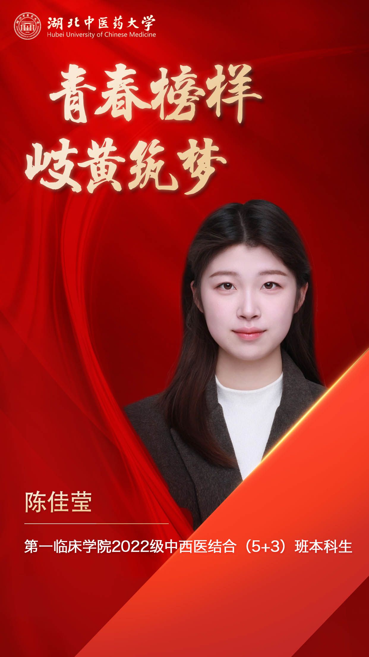 陈佳莹,第一临床学院2022级中西医结合(5+3)班本科生。依托“东璧先生”艺术实践工作坊,组建跨学科团队,以中医药古籍为载体,引入非遗古籍修复技艺,策划“典籍活化三部曲”实践框架,形成“传承-修复-艺术-创生”的美育闭环。负责项目获全国第七届大学生艺术展演二等奖,推动300余名学生在艺术创作中领悟中医药文化精髓,助力学校擦亮李时珍中医药文化品牌。