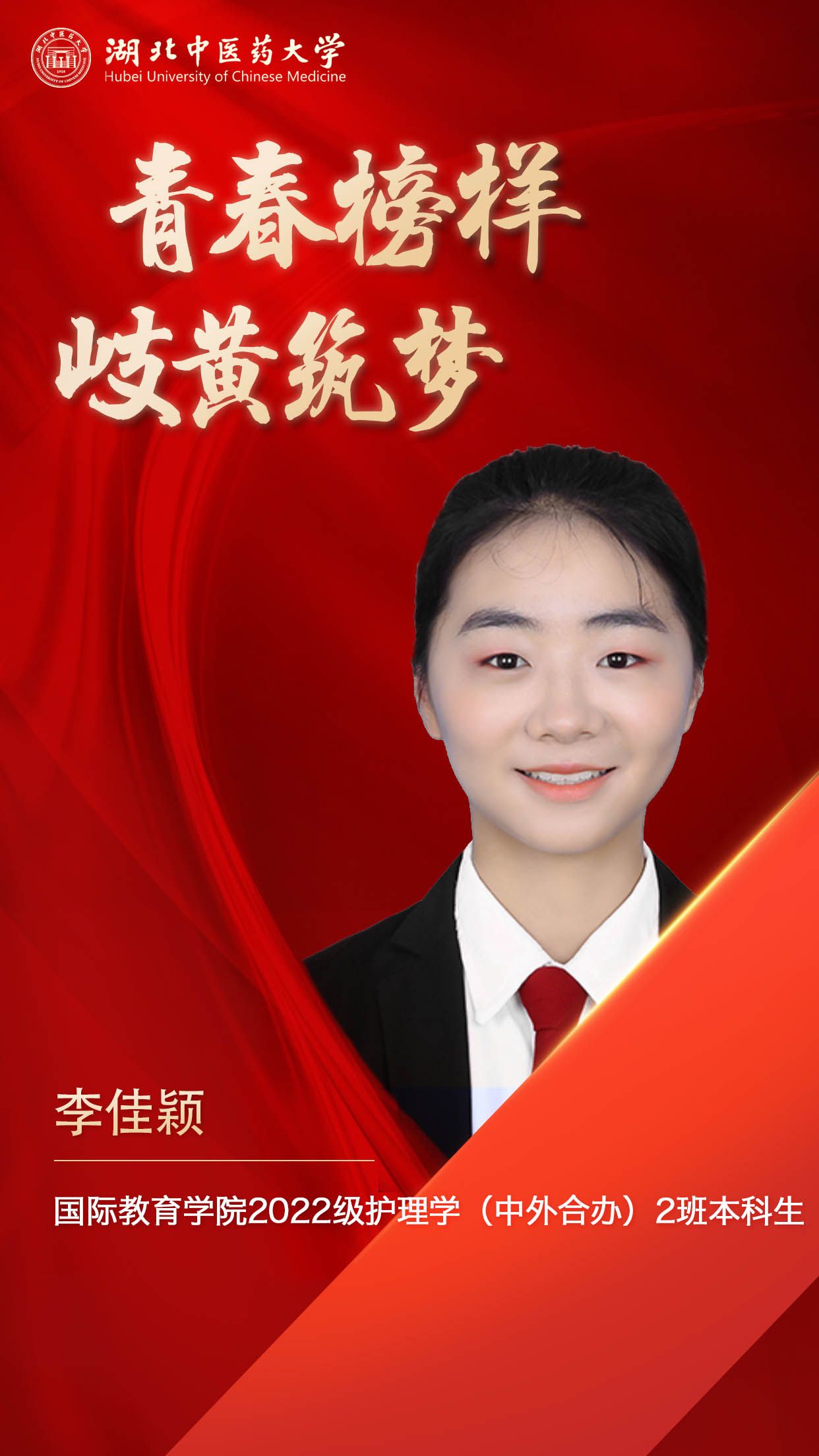 李佳颖,国际教育学院2022级护理学(中外合办)2班本科生。积极参加太极拳比赛、足球赛等文体活动,获校级奖励;参与2025年武汉马拉松、学校毕业典礼、迎新晚会等大型活动志愿服务;发挥专业特长,将人文关怀融入基层服务,赴社区街道、洪山区社会福利院开展志愿服务。获急救CPR技能认证。