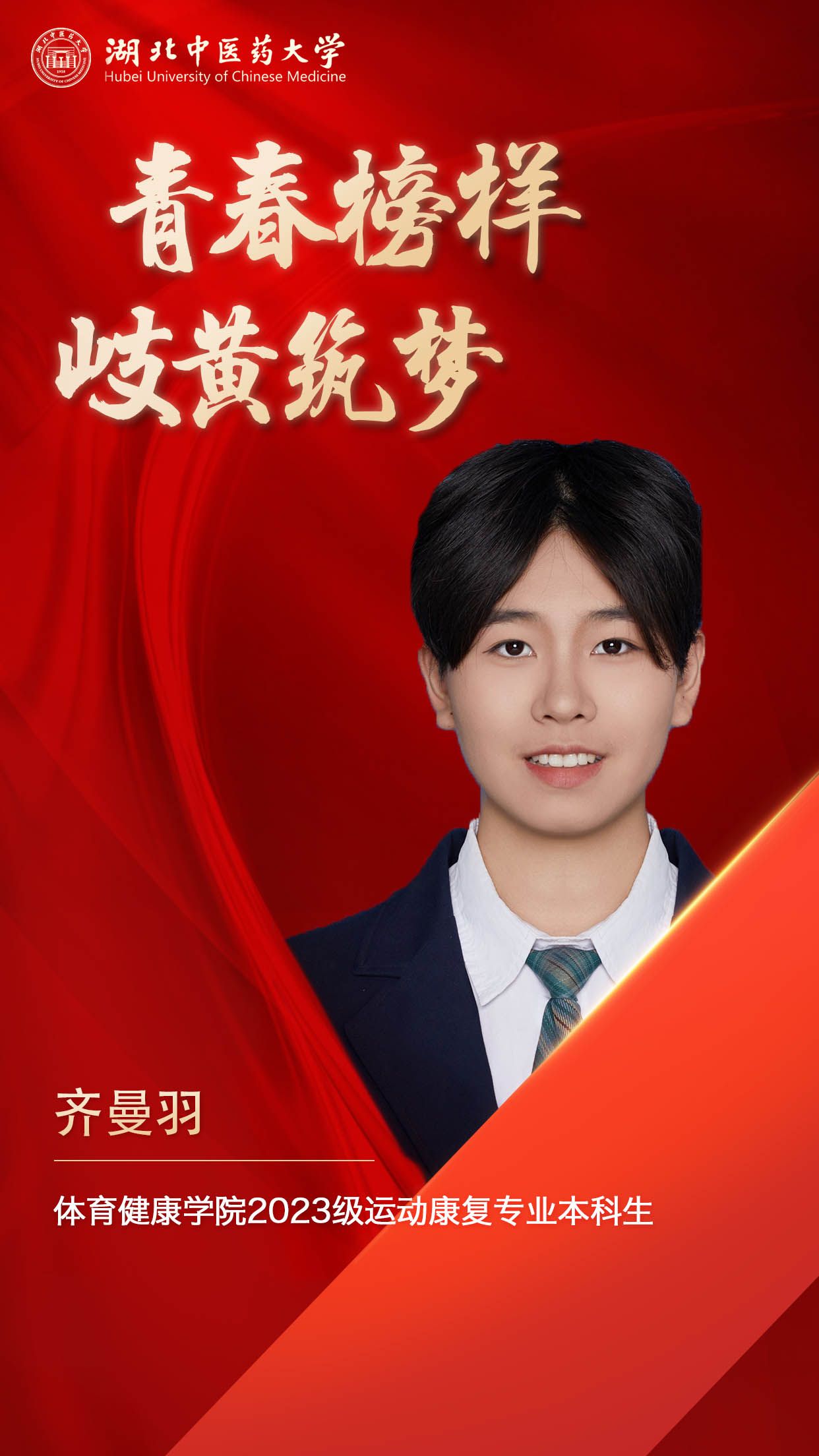 齐曼羽,体育健康学院2023级运动康复专业本科生,学校武术队队员,坚持以赛促学,获校级奖学金两次,斩获全国大学生武术套路锦标赛亚军,全国健身气功锦标赛二等奖2项、三等奖1项,在省级武术赛事中屡创佳绩。带领200余名同学开展太极拳训练,弘扬传统体育文化。