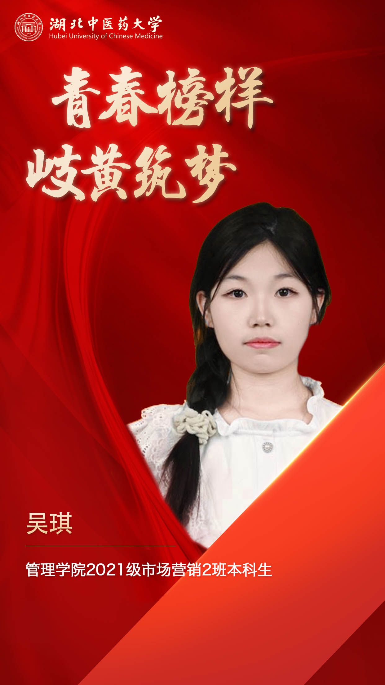 吴琪,管理学院2021级市场营销2班班长,学院创新创业联盟主席。以“中医药健康+管理”为方向,组建跨学科团队,聚焦茅苍术挥发油核心成分,研发“神术”系列中药口腔健康产品,推动茅苍术生态种植、资源保护、高效利用、产品开发全链条发展,获校级及以上创新创业竞赛奖励12项。