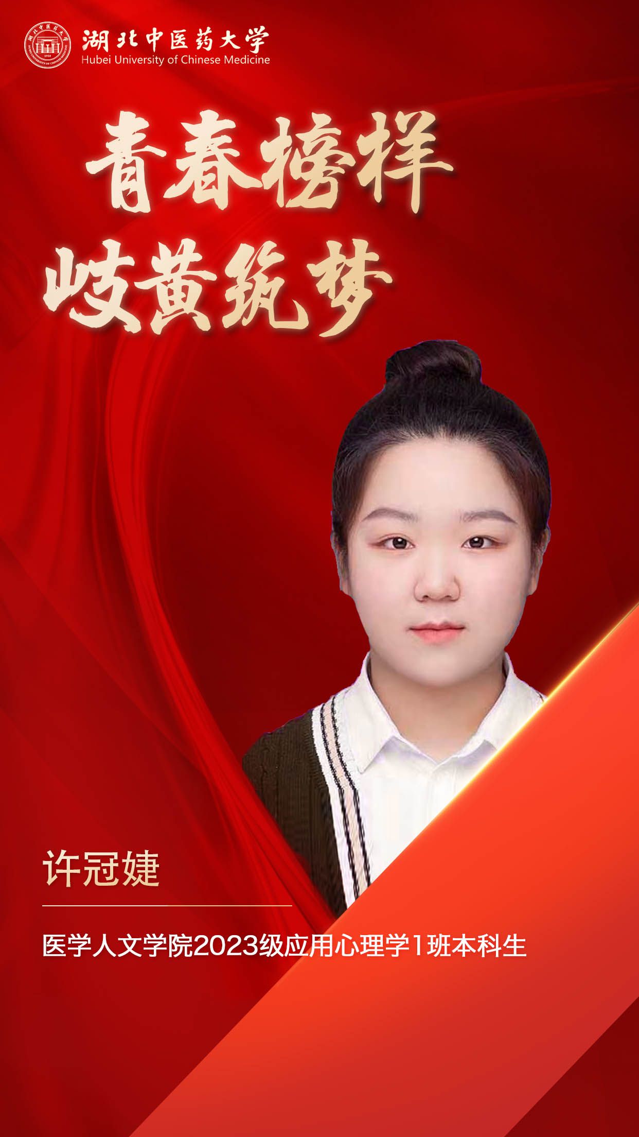 许冠婕,医学人文学院2023级应用心理学1班本科生,学院学生会轮值主席。组织申报教育部“推普助力乡村振兴”暑期社会实践项目,带领团队走进房县、蕲春等地,开展推广普通话·弘扬中医药文化活动,将“文化润鄂”落到实处,为赓续中华文明倾注青春力量。获评2025年武汉马拉松“十佳志愿者”。