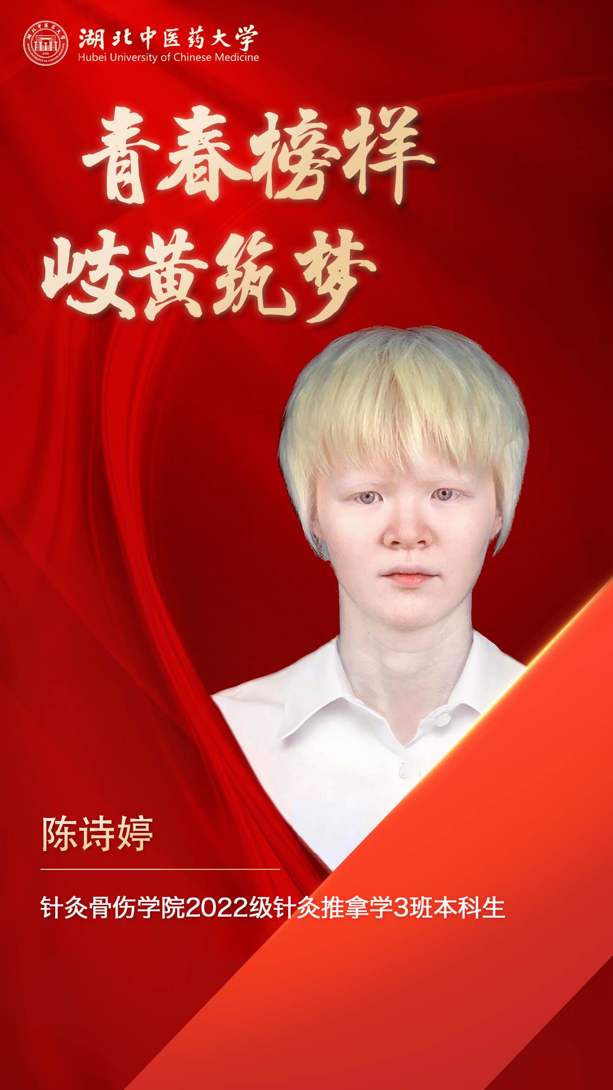 陈诗婷,针灸骨伤学院2022级针灸推拿学3班本科生。她克服先天视力障碍,自强不息、刻苦钻研、积极进取,获国家励志奖学金、校级奖学金、优秀团员、班级先进个人等奖励7次;主动参与近十个月的临床跟诊,锤炼专业技能;投身创新创业工作,参与中医药文创设计、科普宣教等项目,积极参加“互联网+”大学生创新创业大赛。