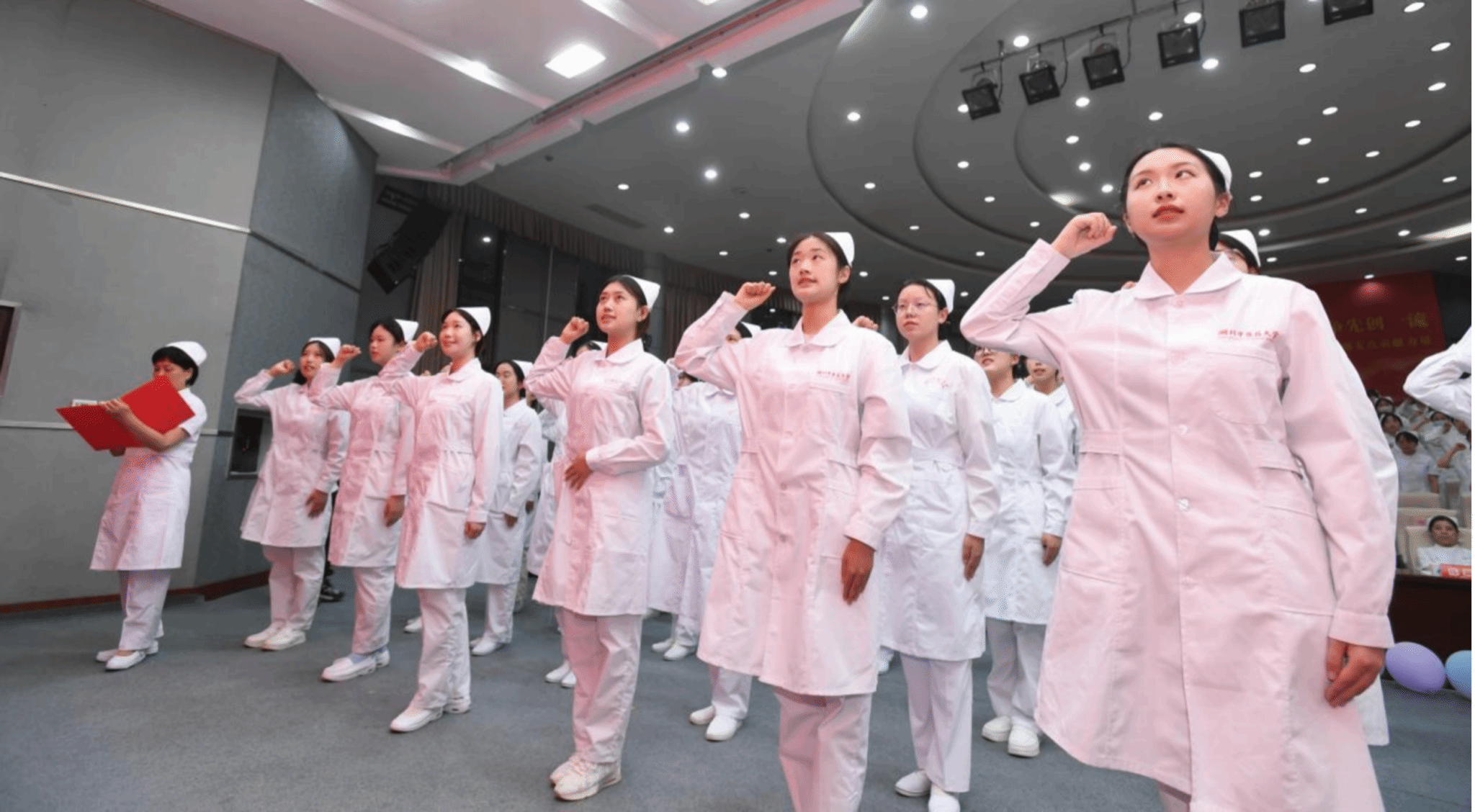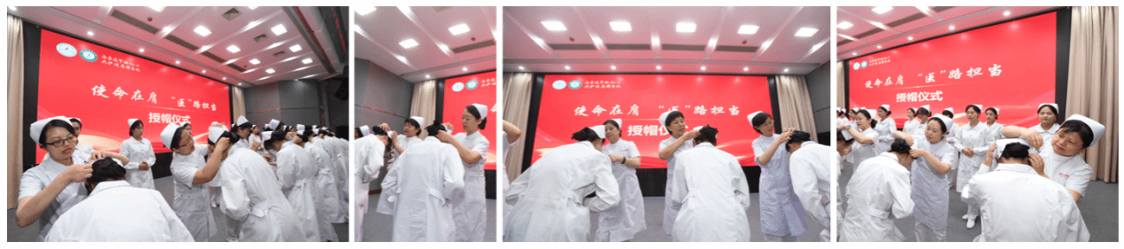第一临床学院、护理学院负责人和护理学院、附属医院护理部专家团队为即将开始实习的2022级学生代表佩戴上圣洁的燕尾帽。在护理学院负责人带领下,师生们怀揣对生命的敬畏、对护理事业的热爱庄严宣誓,以坚定的职业信念,开启守护生命的新征程。