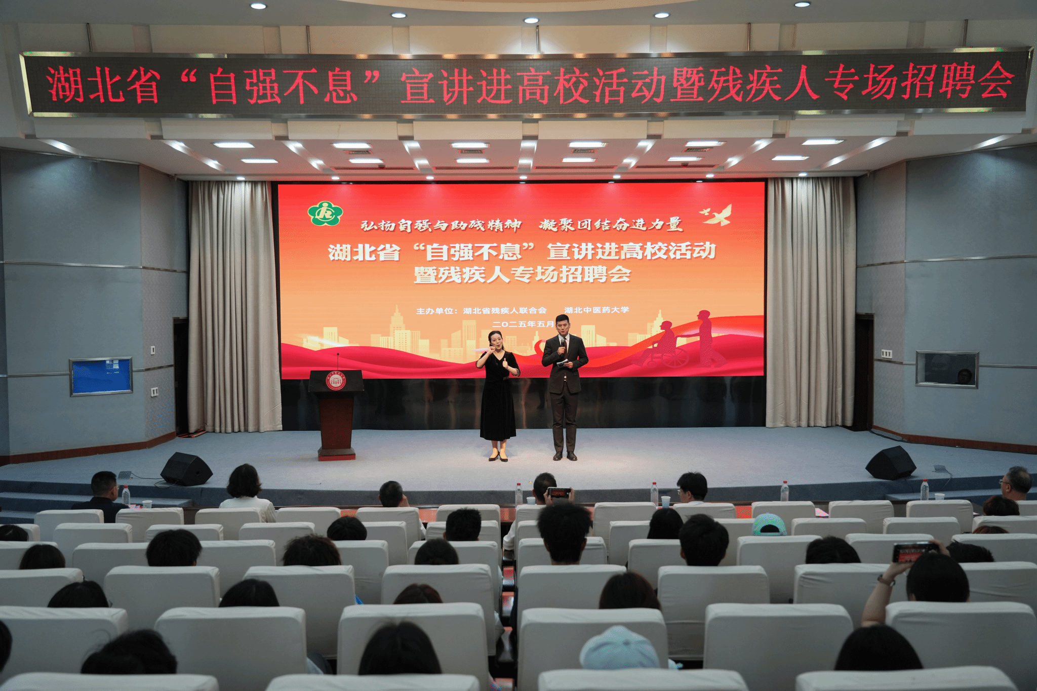 本网讯 5月29日,由湖北省残疾人联合会和我校联合主办的湖北省“自强不息”宣讲进高校暨残疾人专场招聘会活动在学校黄家湖校区明德楼学术报告厅举行。省残联党组成员、副理事长毛建东,学校党委副书记杨波、副校长曹继刚等出席活动,近300名师生医护员工参加活动。