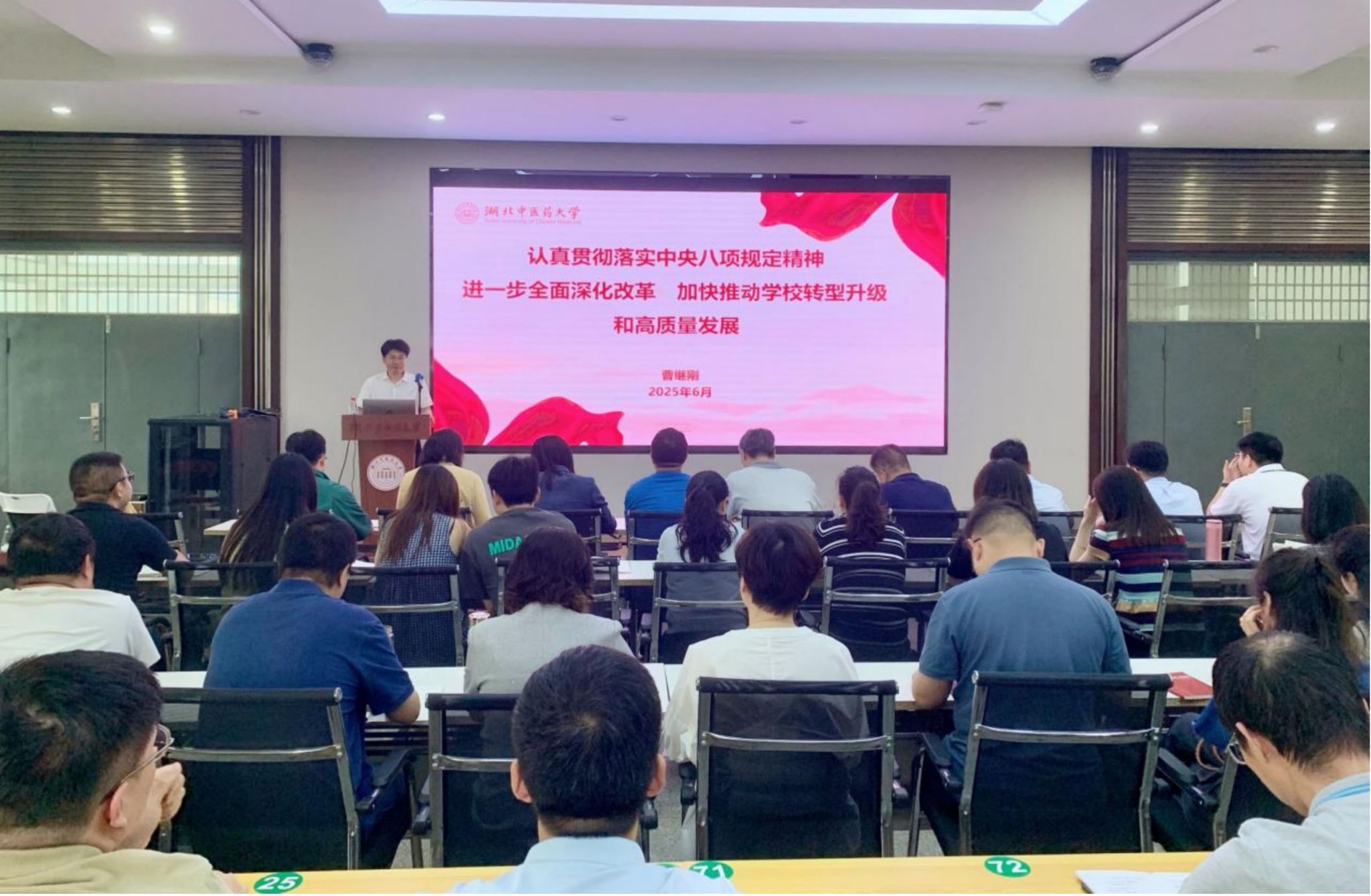 曹继刚阐述了开展深入贯彻中央八项规定精神学习教育的重点任务,强调要在一体推进学查改上再深化、再加力,切实做到学有质量、查有力度、改有成效。他还结合学校在转型升级和高质量发展中的基础、成效和挑战,对《中共湖北中医药大学委员会关于进一步全面深化改革 加快推动学校转型升级和高质量发展的若干举措》进行解读,详细阐释了“九个深化”改革与“九大能力”提升等内容,并围绕教育教学改革、数智化升级等方面创新路径进行了部署。他指出,要以优良作风推动改革任务落实落地,从学科专业优化、人才培养模式创新、科研成果转化等方面发力,真抓实干,奋力书写学校转型升级和高质量发展新篇章。