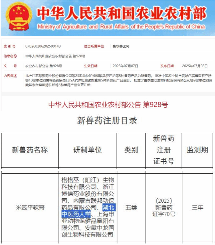 本网讯 7月8日,农业农村部发布第928号公告,批准5种兽药产品为新兽药。我校药学院卢山教授团队与企业历时五年联合研发申报的“米氮平软膏”获批核发国家《新兽药注册证书》。(证书号:(2025)新兽药证字70号)。