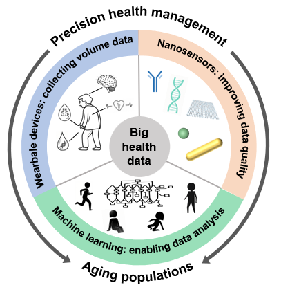 人口老龄化已成为21世纪全球面临的重大社会挑战之一。对老年人群体实施精准健康管理的需求愈发迫切。随着大数据时代到来,健康信息的指数级增长正以前所未有的速度加速推动老年人精准健康管理策略的革新与发展。在此背景下,可穿戴设备、纳米传感器以及机器学习这三项前沿技术的有机融合,成为驱动大健康数据在老年健康管理应用中发挥关键作用的重要力量。可穿戴设备作为收集大健康数据的关键工具,能够实时、持续监测多样化的健康指标。纳米传感器可集成到可穿戴设备中,显著提升检测的灵敏度和特异性,从而增强数据采集的准确性和可靠性。与此同时,机器学习为大规模健康数据的快速高效分析提供了强大支撑。论文以“大健康数据”为核心视角,综述了可穿戴设备、纳米传感器和机器学习在精准健康管理领域的协同作用。文章探讨了可穿戴设备在收集海量健康信息方面的关键作用、纳米传感器有效提升数据质量及机器学习算法对大健康数据精准分析的贡献,并从“诊断-分析-预防”维度提出了多种积极主动的健康管理策略,对上述技术未来趋势进行展望,旨在推动老年人全面健康管理、精准诊断和个性化医疗的进一步发展。